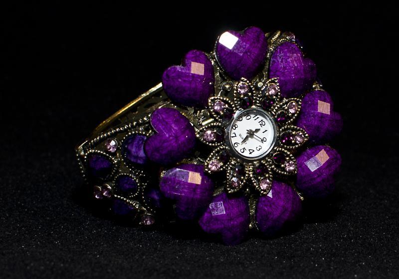 Ceas pe bratara fixa, cu pietre in forma de inimioara, pe o culoare mov ce se potriveste foarte bine stilurilor clasice si nu numai.